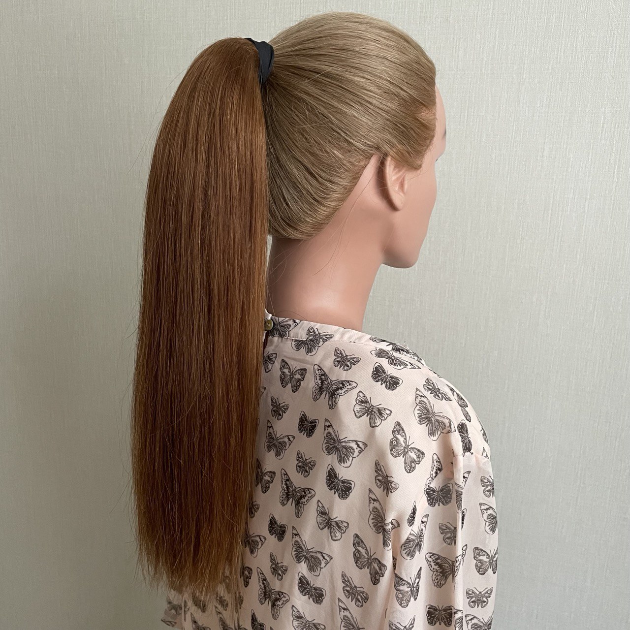 Хвост имеет удобное крепление на ленте. Фиксируется просто и быстро, хорошо держится. Волосы полностью натуральные, европейские без примесей. Благодаря хорошему качеству волос, хвосты долго носятся и хорошо выглядят, длительное время сохраняют красивый вид. Волосына можно мыть, завивать, выпрямлять. Для укладки можно использовать фен, бигуди, плойки, утюжки. Накладной хвост подойдет как для вечерних причесок, так и для ежедневной носки.