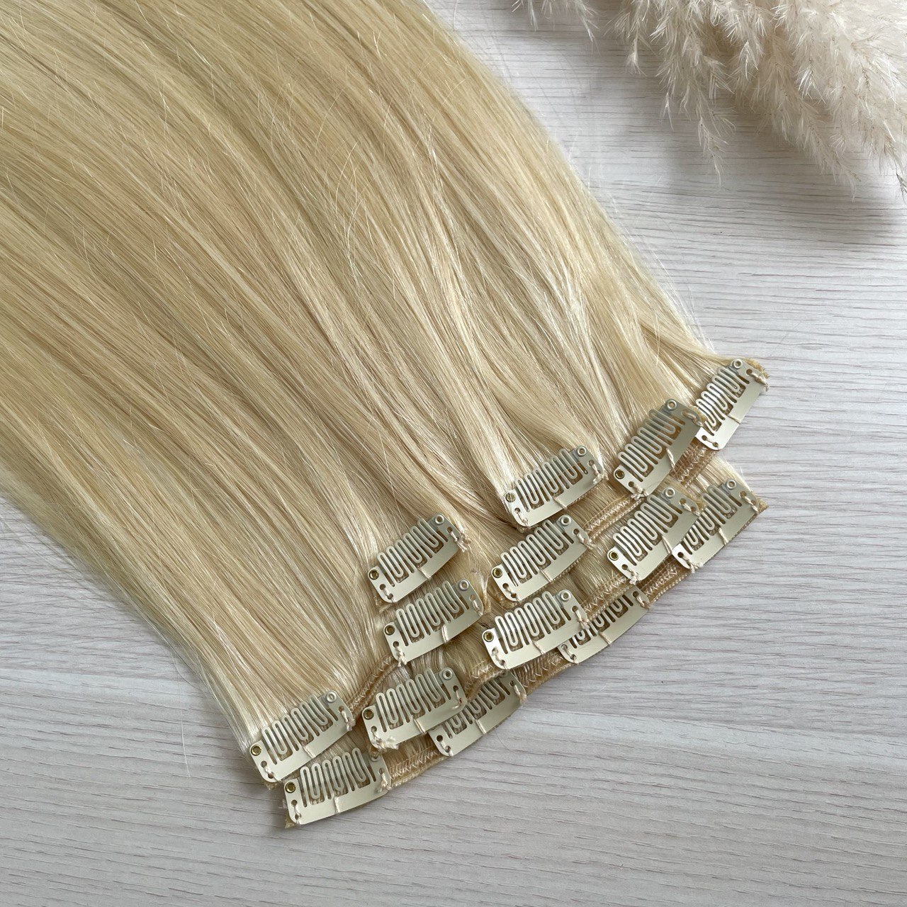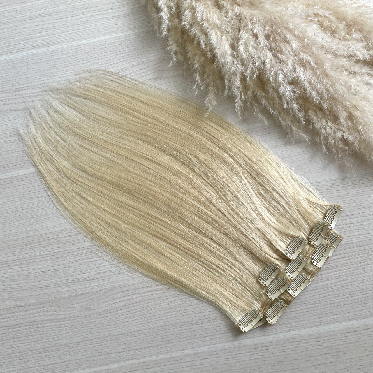 Накладные волосы на заколках – это набор накладных прядей, которые крепятся к своим волосам благодаря заколочкам с силиконовой прослойкой, с помощью которых пряди хорошо держатся и не сползают. Трессы на заколках подходят для девушек, которые хотят длинные и густые волосы. Они подойдут для ежедневной носки (можно сделать сложную укладку, собрать красивый хвост или оставить волосы распущенными) так и для создания вечерних и свадебных образов. Заколки не заметны, любая прическа будет выглядеть естественно.Наши волосы на заколках не содержат искусственных примесей. С ними можно делать всё, что со своими собственными волосами: тонировать, окрашивать, сушить феном, мыть, использовать плойки и утюжки. Волосы европейские премиум класса обеспечат длительную носку и отличный внешний вид в ходе использования.