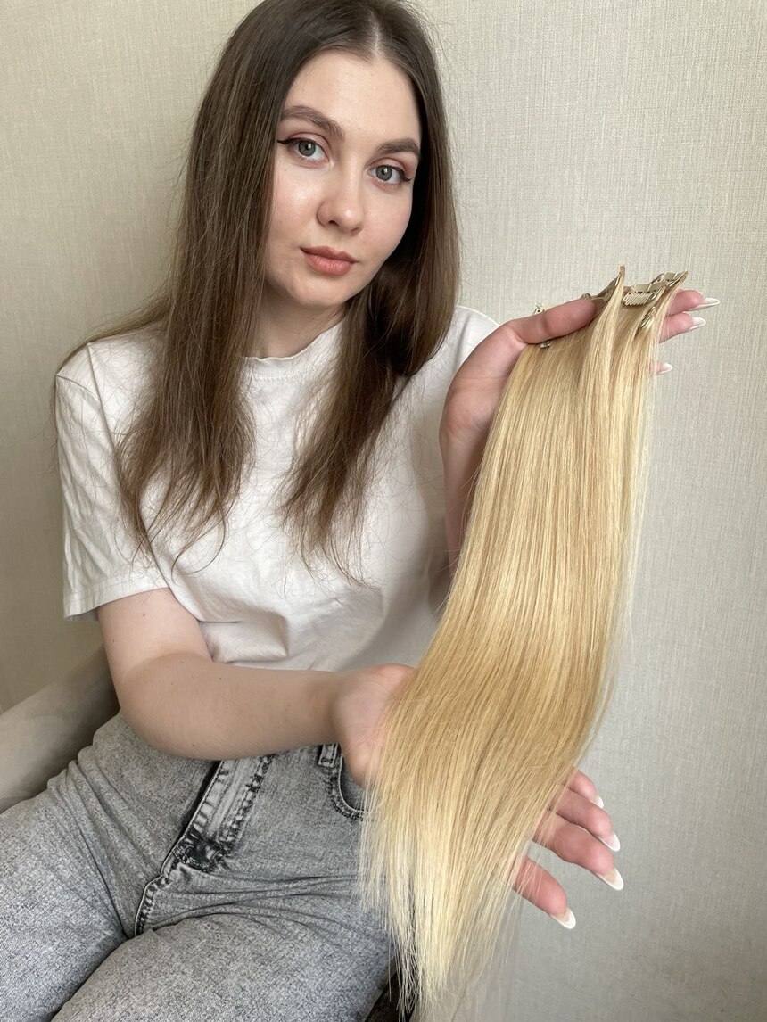 Накладные волосы на заколках – это набор накладных прядей, которые крепятся к своим волосам благодаря заколочкам с силиконовой прослойкой, с помощью которых пряди отлично держатся и не сползают. Волосы на заколках подходят для девушек, которые хотят длинные и густые волосы. Они подойдут как для создания свадебных и вечерних образов, так и для ежедневной носки (можно сделать сложную и легкую укладку, красивые курди или собрать пышный хвост). Заколки незаметны в прическе и не причинят вреда вашим собственным волосам. Наши трессы на заколках не содержат искусственных примесей. С ними можно делать всё, что со своими собственными волосами: окрашивать, тонировать, сушить феном, мыть, использовать плойку и утюжок. Трессы европейские премиум класса обеспечат длительную носку и отличный внешний вид в ходе использования.