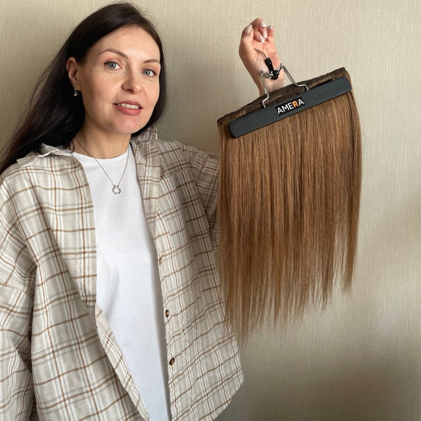 Комплект состоит из трех накладных широких прядей на заколках. Трессы, шириной 24 см и 19 см (+-2 см), крепятся по затылочной стороне, а также по бокам. Трехпрядный набор легок в использовании. При этом волосы распределяются по голове естественно. Заколочки крепкие с силиконовой прослойкой, которая защищает свои волосы от повреждения. Волосы можно мыть, завивать, стричь, окрашивать, тонировать - делать все то же самое, что и со своими волосами.