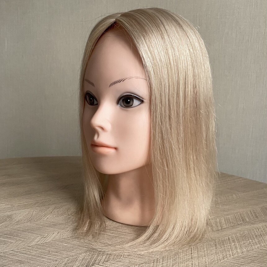 С полной имитацией кожи головы. Повышенная густота. Пробор можно делать на любую сторону. Волосы 100% натуральные, можно тонироватьть, мыть, укладывать.
