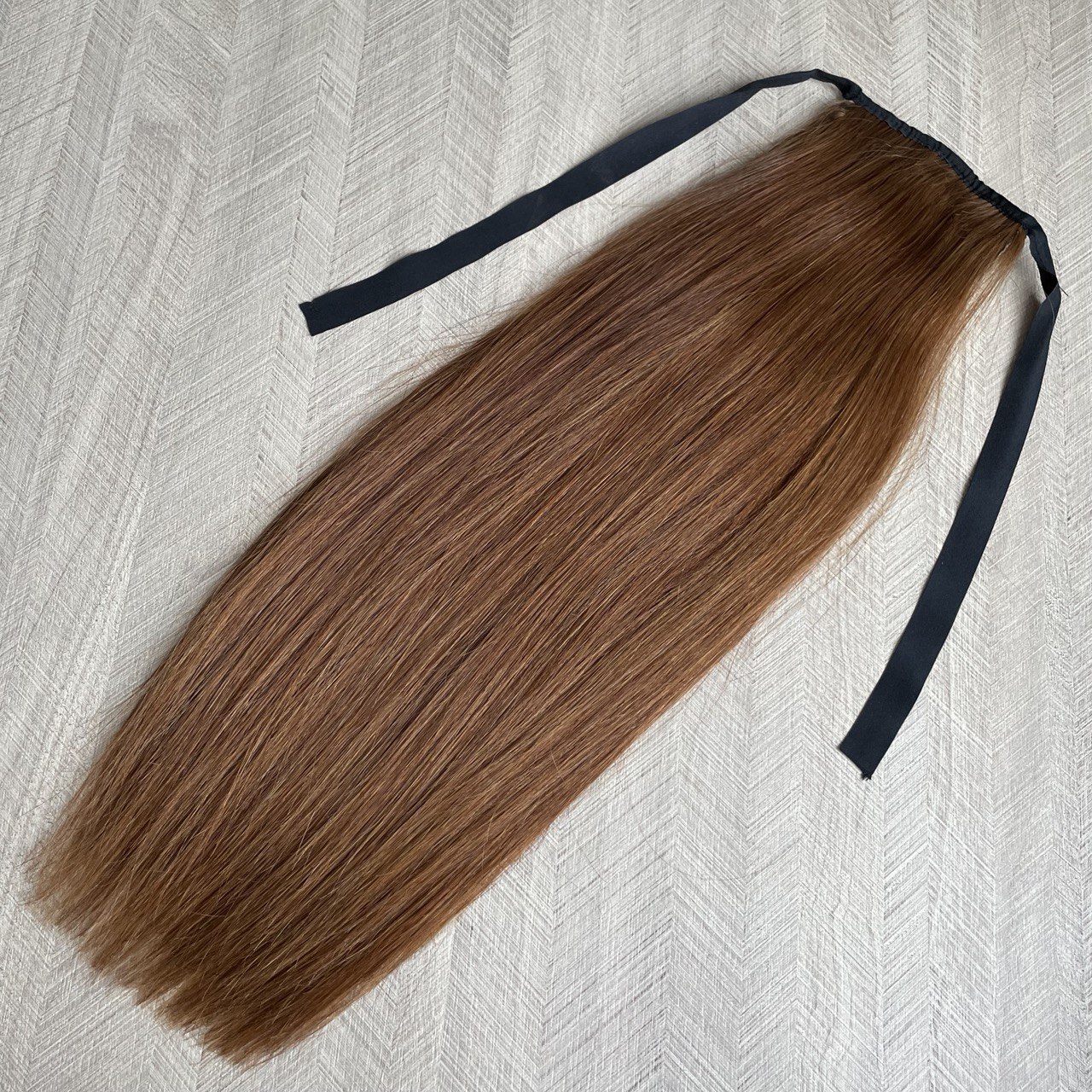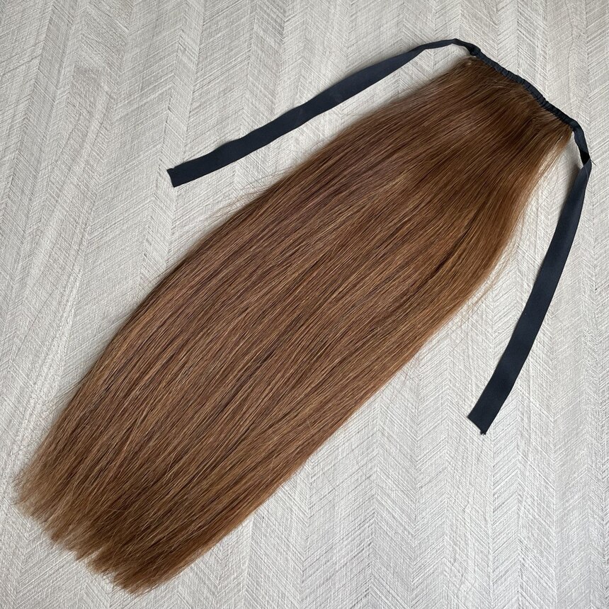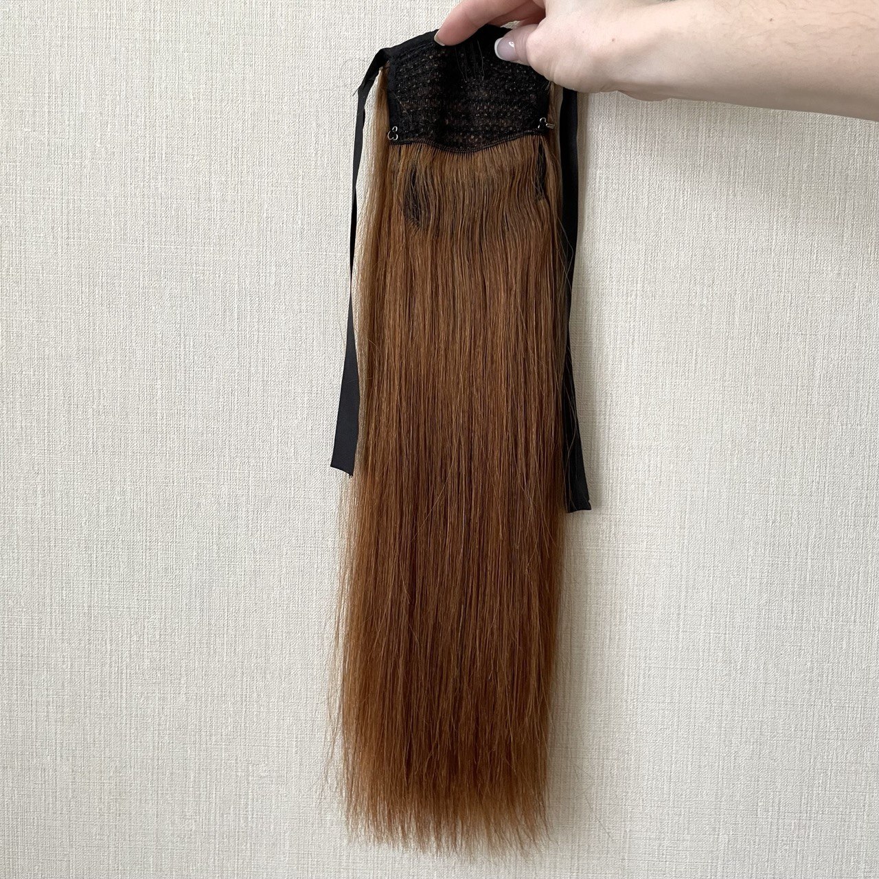 Хвост имеет удобное крепление на ленте. Фиксируется просто и быстро, хорошо держится. Волосы полностью натуральные, европейские без примесей. Благодаря хорошему качеству волос, хвосты долго носятся и хорошо выглядят, длительное время сохраняют красивый вид. Волосына можно мыть, завивать, выпрямлять. Для укладки можно использовать фен, бигуди, плойки, утюжки. Накладной хвост подойдет как для вечерних причесок, так и для ежедневной носки.