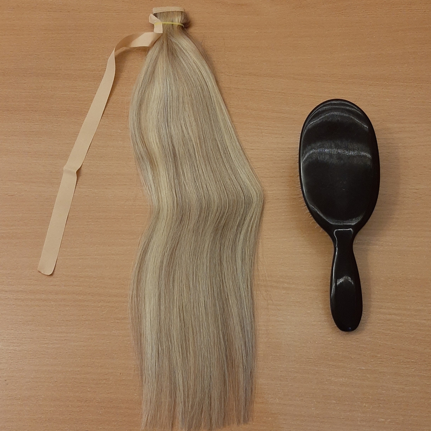 Хвост-шиньон на ленте имеет простое крепление. Закрепляется быстро и легко, хорошо держится. Волосы полностью натуральные без примесей, имеют красивый мелированный пепельный оттенок. Благодаря высокому качеству волос, хвосты долго носятся и хорошо выглядят при правильном уходе за ними. Волосы можно мыть, завивать, выпрямлять и делать все тоже самое, что со своими волосами. Бигуди, плойки, утюжки также подойдут для укладки. Хвост можно носить как и на вечерники , так и ежедневно.