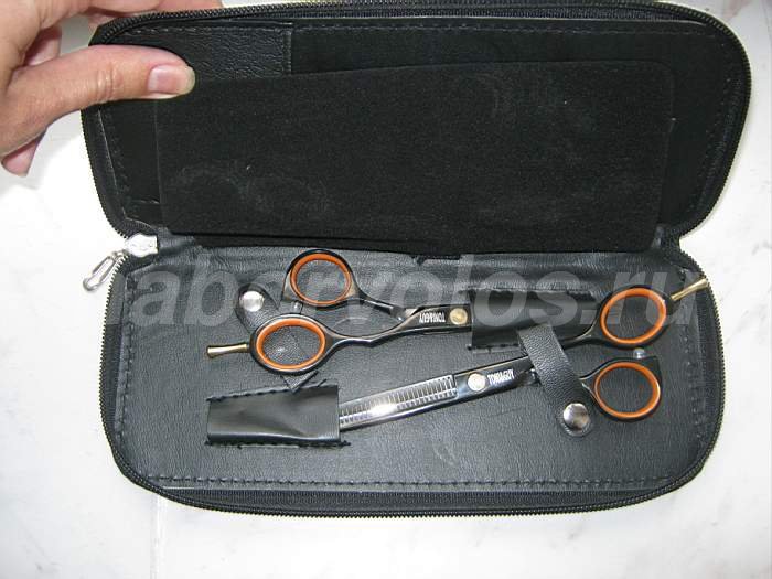 Комплект профессиональных ножниц изготовлен из высококачественной прочной стали. Ножницы легко и быстро стригут, надолго сохраняют заточку, удобно лежат в руке - имеют упор для мизинца. Набор ножниц подходит для профессиональных парикмахеров и для личного пользования.