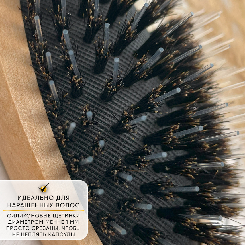 Натуральная щетка для волос - это удобный и экологичный инструмент для ухода за волосами. Деревянная расческа из натуральной щетины предназначена для наращенных и натуральных волос. Щетка из дерева разработана специальным образом, чтобы мягко расчесывать даже сильно запутанные волосы благодаря двухуровневым щетинам. Первый уровень щетины, изготовленной из натурального материала, помогает разглаживать и расчесывать верхний слой волос. Второй уровень щетины состоит из специальных силиконовых вставок, которые длиннее и реже расположены. Они аккуратно расчесывают волосы у самого корня. Силиконовые щетинки имеют срезанные кончики, чтобы не зацепляться за капсулы наращенных волос. Деревянная расческа эффективно устраняет статическое электричество, не нанося вреда даже самым тонким натуральным и нарощенным волосам. Деревянная щетка для волос подойдёт для взрослых и детей, для вьющихся, прямых, поврежденных, натуральных, наращённых волос. Натуральная щетка также отлично подойдет для людей с чувствительной кожи головы, так как не вызывает раздражения и аллергических реакций. Деревянная расческа может использоваться и для укладки волос. Расческа из натуральной щетины не только хорошо распутывает волосы, но и укрепляет их и стимулирует рост волос. Натуральная расческа - отличный выбор для подарка близкому человеку или для себя.
