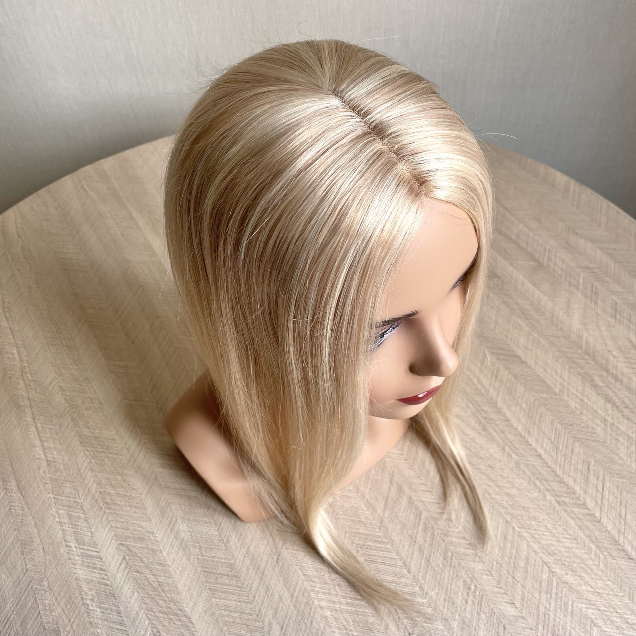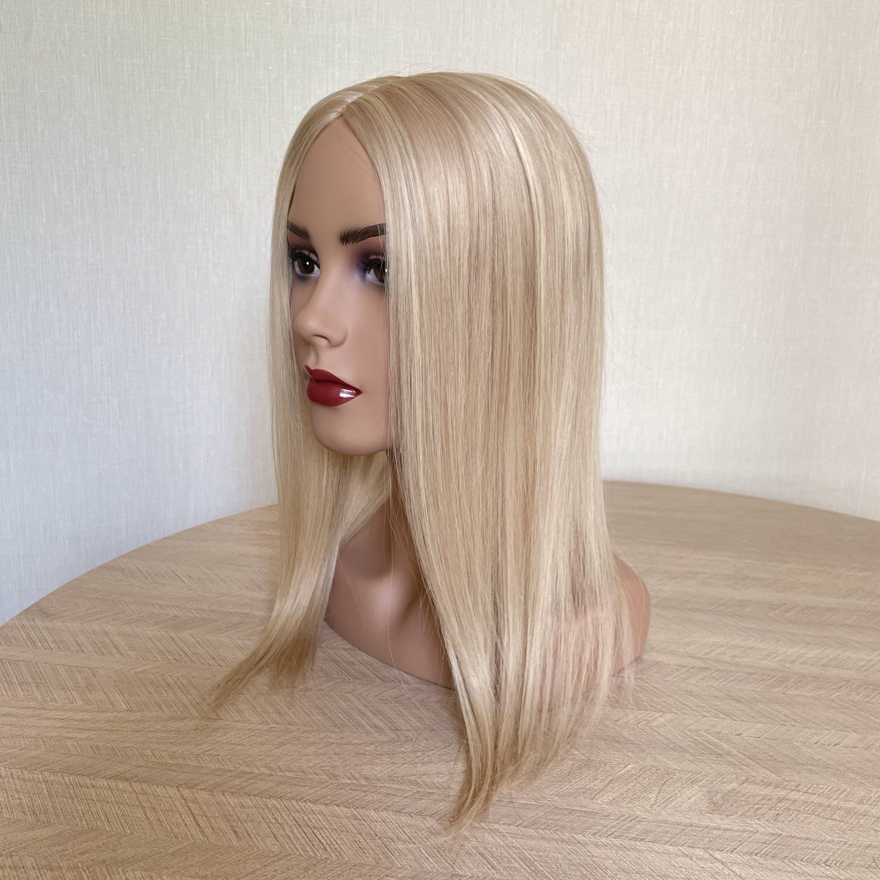 С полной имитацией кожи головы. Повышенная густота. Пробор можно делать на любую сторону. Волосы 100% натуральные, можно тонироватьть, мыть, укладывать.