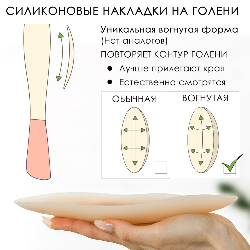 Заказала накладки на голени и очень довольна! Ножки стали заметно ровнее и очень легко одевать. Ношу третью неделю каждый день и клеятся идеально. Заказывала вогнутые и средние по толщине чтоб не перегрузить голень. Боялась что края будут отходить или как-то волной лежать, а нет, все идеально, все ровненько, это именно то качество которое я искала! Они точно стоят своих денег. Небольшой нюанс это то что накладки по сравнению с моей кожей светловатые, но это уже мелочи! Под джинсы и плотные колготки идеально!